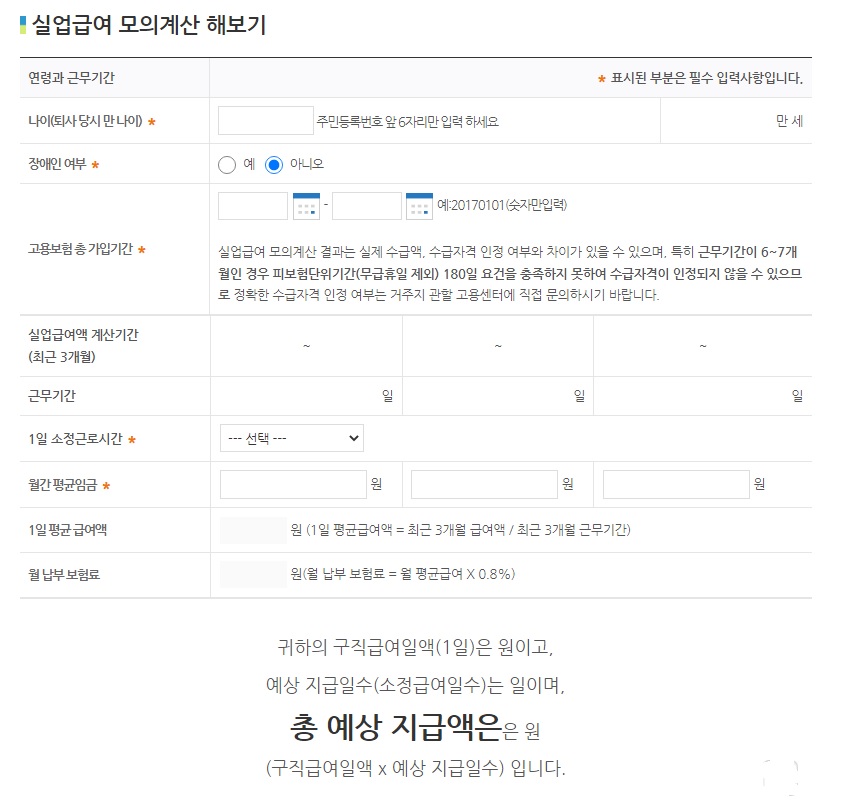 실업급여 계산 할때 입력해야하는 내용입니다.